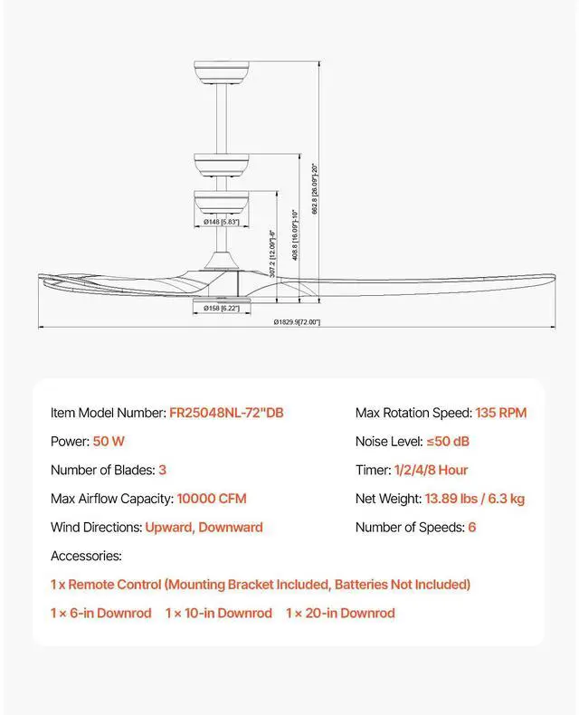 Product Dimensions(10-in Downrod): 70.87 x 16.09"/1800 x 408.6 mm,Product Dimensions(20-in Downrod): 70.87 x 26.09"/1800 x 662.8 mm,Color: Walnut,Max Airflow Capacity: 10000 CFM,Product Dimensions(6-in Downrod): 70.87 x 12.09"/1800 x 307.2 mm,Number of Speeds: 6,Wind Directions: Upward, Downward,Noise Level: 50 dB,Timer: 1/2/4/8 Hour,Max Rotation Speed: 135 RPM,Item Model Number: FR25048NL-72"DB,Number of Blades: 3,Net Weight: 13.89 lbs / 6.3 kg,Power: 30 W