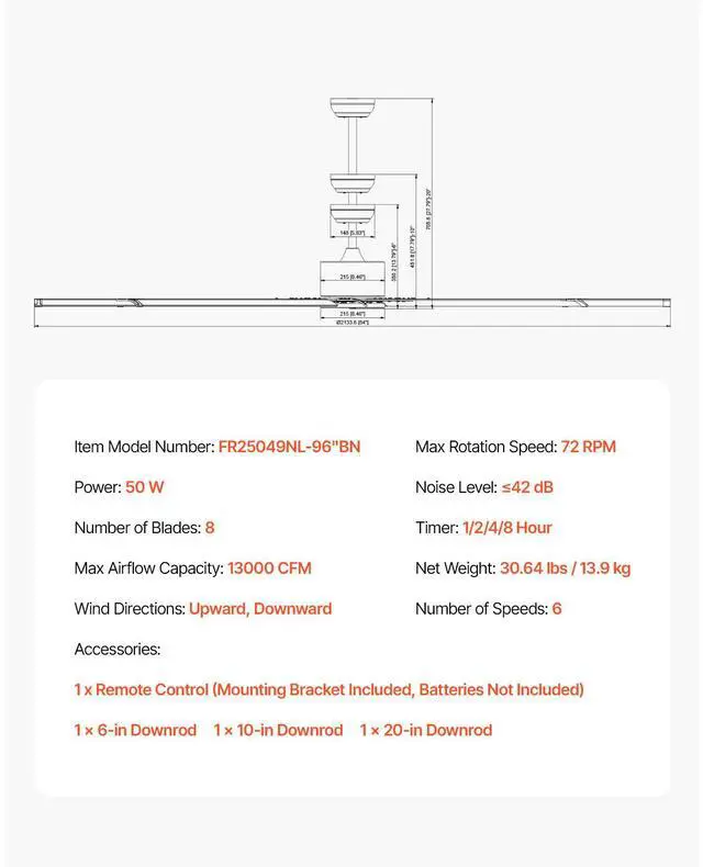 Product Dimensions(10-in Downrod): 95.67 x 17.79" /2430 x 451.8 mm