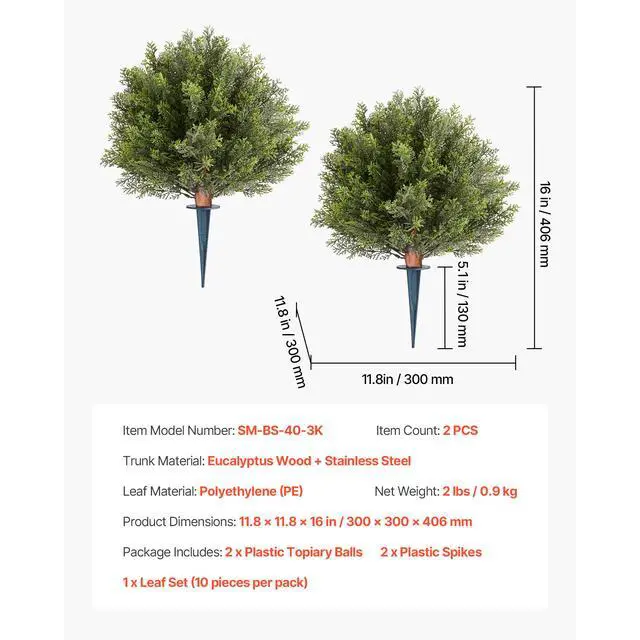 Trunk Material: Eucalyptus Wood + Stainless Steel,Item Count: 2 PCS,Item Model Number: SM-BS-40-3K,Item Dimensions: 11.8 x 11.8 x 16 in/300 x 300 x 406 mm,Leaf Material: Polyethylene (PE),Net Weight: 2 lbs/0.9 kg