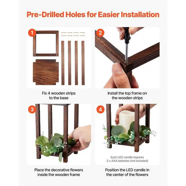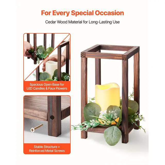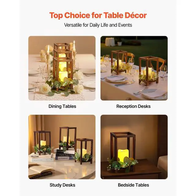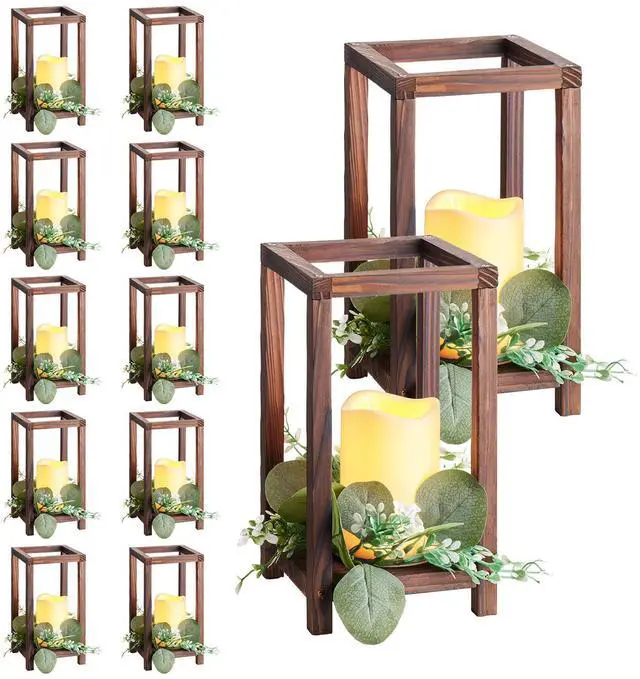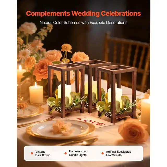 VEVOR 12 Set/36 Pcs Wooden Wedding Lantern Centerpiece, Includes 12 Wooden Lantern Candle Holder 12 Flameless LED Candle 12 Eucalyptus Leaves Wreath for Wedding Table Party Farmhouse Decor, Brown