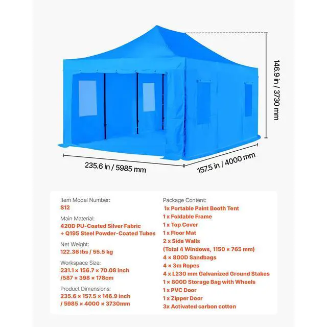 Workspace Size: 231.1(L) x 156.7(W) x 70.08(H) inch/587 x 398 x 178 cm,Item Model Number: S12,Product Dimensions: 235.6 x 157.5 x 146.9 inch/5985 x 4000 x 3730mm,Net Weight: 122.36 lbs / 55.5 kg,Main Material: 420D PU-Coated Silver Fabric + Q195 Steel Powder-Coated Tubes