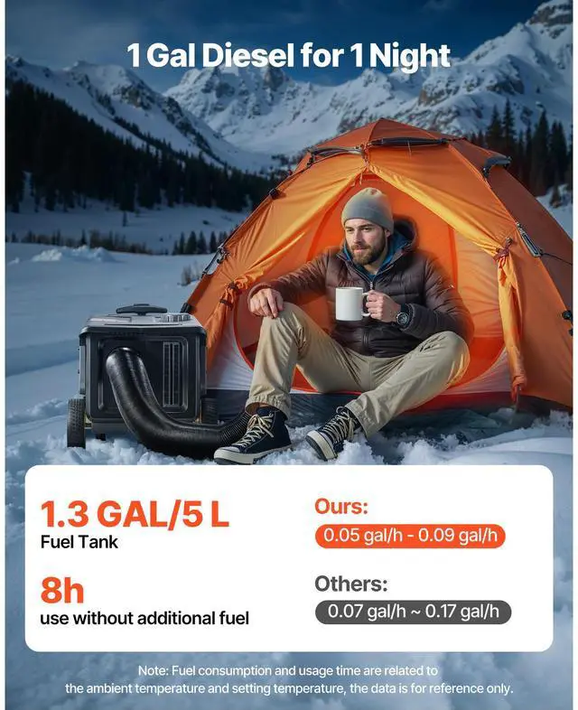 Fuel Consumption: 0.05 - 0.09 gal/h (0.180.37 L/h),Operating Noise: 75 dB,Temperature Adjustment Range: 46.496.8 / 836,Item Model Number: ZM8008,Air-Fuel Ratio: 23004400 rpm, 1.45.0 Hz,Fuel Tank Capacity: 1.3 GAL / 5 L,Overheat Protection: 518 / 270,Air Outlet Diameter: 2.9 inch / 75 mm,Combustion Efficiency: 90%,Product Dimensions: 22.3 x 15.7 x 12.6 inch / 566 x 400 x 321 mm,Net Weight: 24.0 lbs / 10.9 kg (including all accessories)