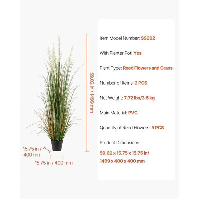 Plant Type: Reed Flowers and Grass,With Planter Pot: Yes,Item Model Number: SS002,Quantity of Plant: 5 reed flowers and grass,Product Dimensions: 59.02 x 15.75 x 15.75 in/1499 x 400 x 400 mm,Number of Items: 2 PCS,Net Weight: 7.72 lbs/3.5 kg,Main Material: PVC