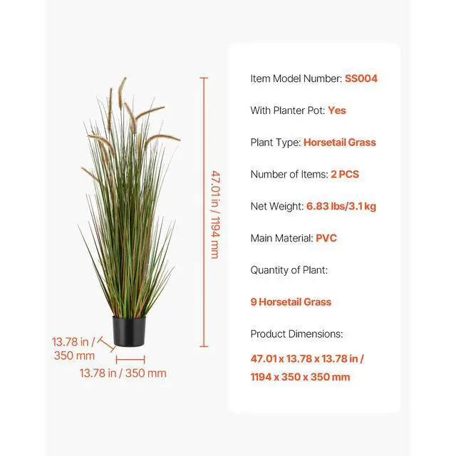 Plant Type: Horsetail Grass,With Planter Pot: Yes,Item Model Number: SS004,Quantity of Plant: 9 Horsetail Grass,Product Dimensions: 47.01 x 13.78 x 13.78 in/1194 x 350 x 350 mm,Number of Items: 2 PCS,Net Weight: 6.83 lbs/3.1 kg,Main Material: PVC
