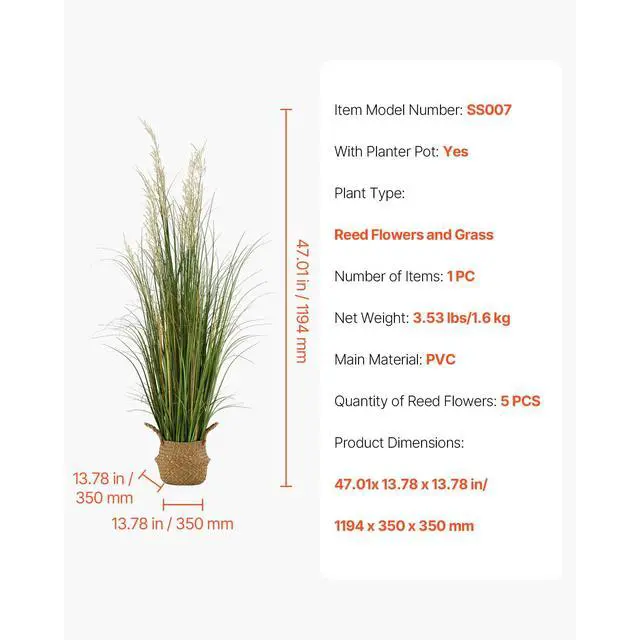 Plant Type: Reed Flowers and Grass,With Planter Pot: Yes,Item Model Number: SS007,Quantity of Plant: 5 reed flowers and grass,Product Dimensions: 47.01 x 13.78 x 13.78 in/1194 x 350 x 350 mm,Number of Items: 1 PC,Net Weight: 3.53 lbs/1.6 kg,Main Material: PVC