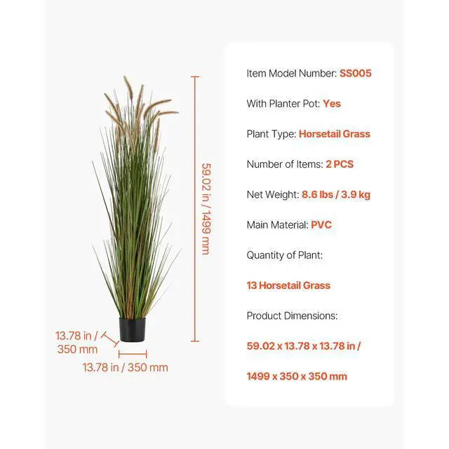 Plant Type: Horsetail Grass,With Planter Pot: Yes,Item Model Number: SS005,Quantity of Plant: 13 Horsetail Grass,Product Dimensions: 59.02 x 13.78 x 13.78 in/1499 x 350 x 350 mm,Number of Items: 2 PCS,Net Weight: 9.26 lbs/4.2 kg,Main Material: PVC