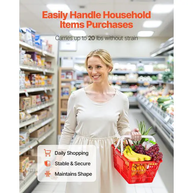 VEVOR Shopping Baskets, 12 PCS, 21L Stackable PE Plastic Grocery Baskets with Handles, Dense Mesh Structure, Holds up to 20 lbs, Portable for Grocery, Retail, Stores, Supermarket, Home Use, Red