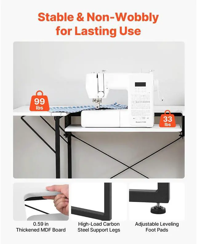VEVOR Sewing Table, Multipurpose Sewing Machine Table with Foldable Side Shelf, Adjustable Shelf, Steel Legs, Computer Desk for Home, Fashion Studio, Art Studio, Educational Institution, White