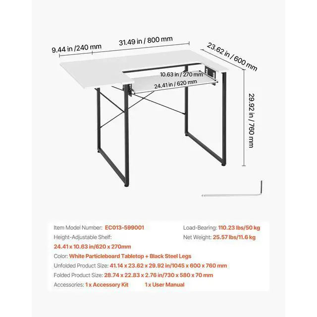 Height-Adjustable Shelf: 24.41 x 10.63 in/620 x 270mm,Unfolded Product Size: 41.14 x 23.62 x 29.92 in/1045 x 600 x 760 mm,Color: White MDF Tabletop + Black Steel Legs,Item Model Number: EC013-599001,Load-Bearing: 110.23 lbs/50 kg,Folded Product Size: 28.74 x 22.83 x 2.76 in/730 x 580 x 70 mm,Net Weight: 28.66 lbs/13.0 kg