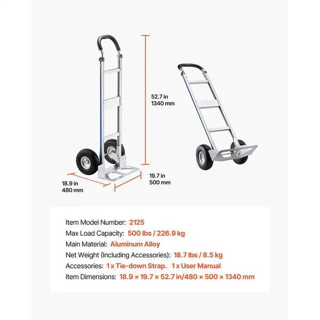 Net Weight (Including Accessories): 18.7 lbs / 8.5 kg,Item Model Number: 2125,Max Load Capacity: 500 lbs / 226.9 kg,Item Dimensions: 18.9 x 19.7 x 52.7 in/480 x 500 x 1340 mm,Main Material: Aluminum Alloy