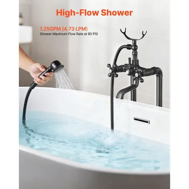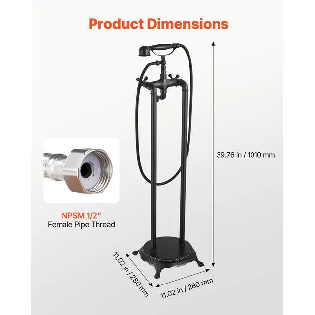 Installation Method: Floor Standing,Shower Flow Rate: 1.25 GPM / 4.73 LPM @ 80 PSI,Shower Hose Length: 59 inch / 1.5 m,Item Model Number: 318,Set Includes: Bathtub Faucet and Handheld Shower,Thread Type: NPSM 1/2" Female,Product Dimensions: 11.02 x 11.02 x 39.76 in / 280 x 280 x 1010 mm,Net Weight: 10.58 lbs / 4.8 kg