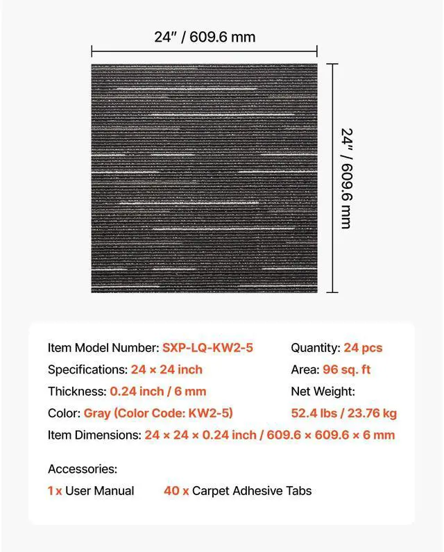 Thickness: 0.24 inch / 6 mm,Area: 96 sq. ft,Main Materials: Polypropylene and Asphalt,Specifications: 24 x 24 inch,Color: Gray,Item Model Number: SXP-LQ-KW2-5,Quantity: 24 pcs,Item Dimensions: 24 x 24 x 0.24 inch / 609.6 x 609.6 x 6 mm,Net Weight: 52.4 lbs / 23.76 kg