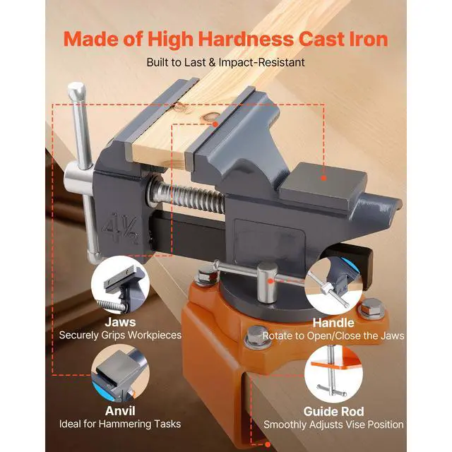 VEVOR Bench Vise, 4.5 Inch, Portable Workbench Vice with 270° Swivel Base, Quick Release Rotating Bench Clamp, Cast Iron Construction, for Woodworking, Metalworking, Drilling, Sawing, Cutting Conduit