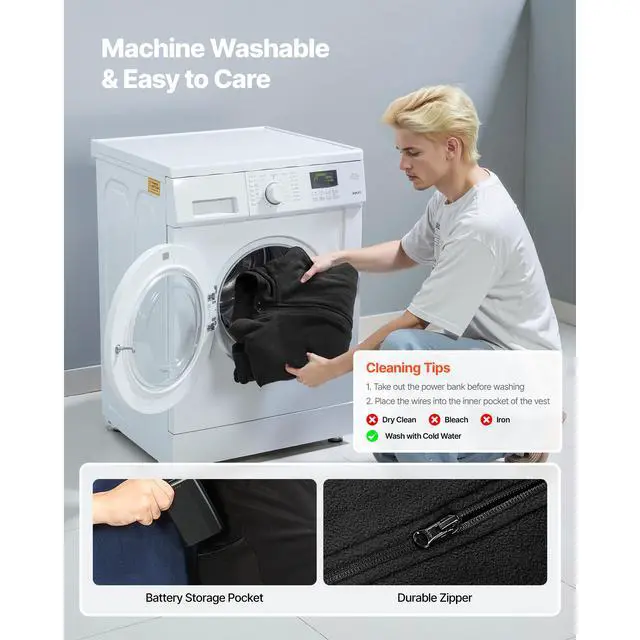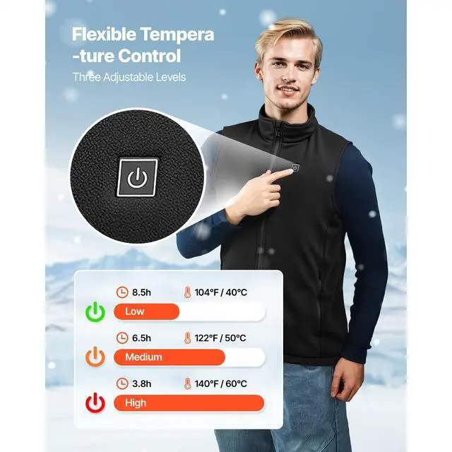Number of Heating Zones: 6 Zones,Heating Zone Locations: 2 x Chest, 2 x Shoulders, 1 x Back, 1 x Neck,Size: L,Temperature Settings: High: 140 °F/60 °C, Medium: 122 °F/50 °C, and Low: 104 °F/40 °C,Item Model Number: RBX-004,Heating Duration: High: 3.8 h, Medium: 6.5 h, and Low: 8.5 h,Input Voltage: 7.4V,Product Dimensions: 30.31 x 23.62 in/790 x 600 mm,Net Weight: 2.03 lbs/0.92 kg