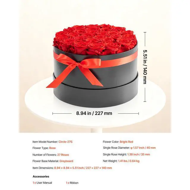 Box Material: Cardboard,Single Rose Height: 1.38 inch / 35 mm,Item Model Number: Circle-27S,Flower Type: Rose,Single Rose Diameter: 1.57 inch / 40 mm,Flower Color: Bright Red (S29),Flower Base Material: Greyboard,Box Shape: Round,Product Dimensions: 8.94 x 8.94 x 5.51 inch / 227 x 227 x 140 mm,Net Weight: 1.21 lbs / 0.55 kg,Number of Flowers: 27 Roses