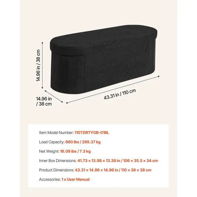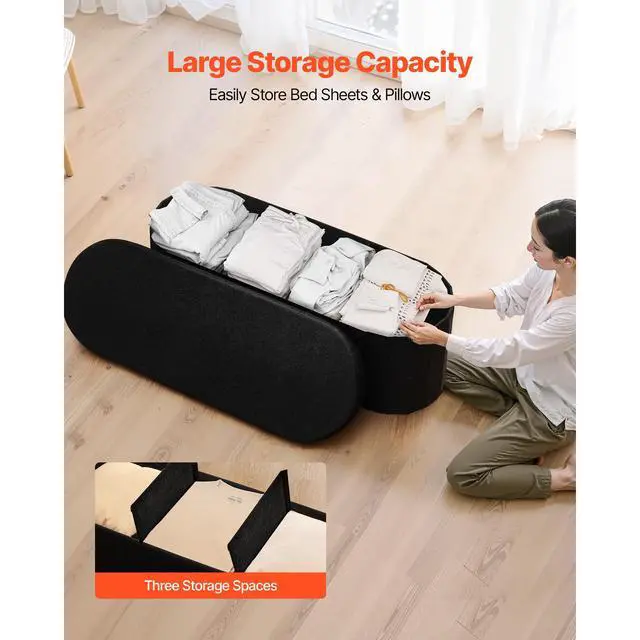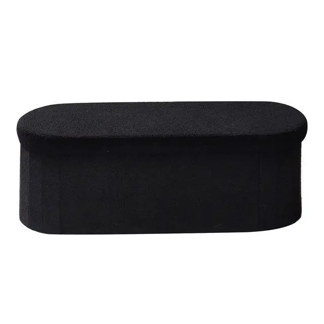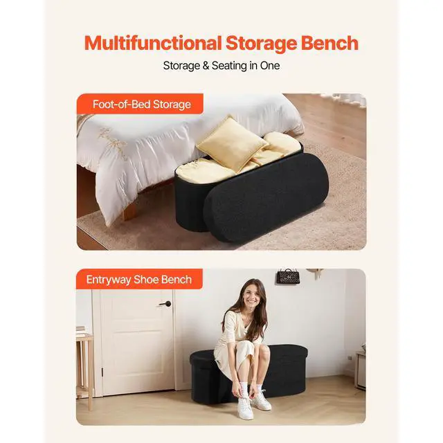 VEVOR Oval Storage Ottoman Bench, Foldable Teddy Fleece End of Bed Bench, Folding Upholstered Bed Ottoman Chest with Large Storage Space, Supports 660 lbs, for Living Room, Bedroom, Entryway, Black