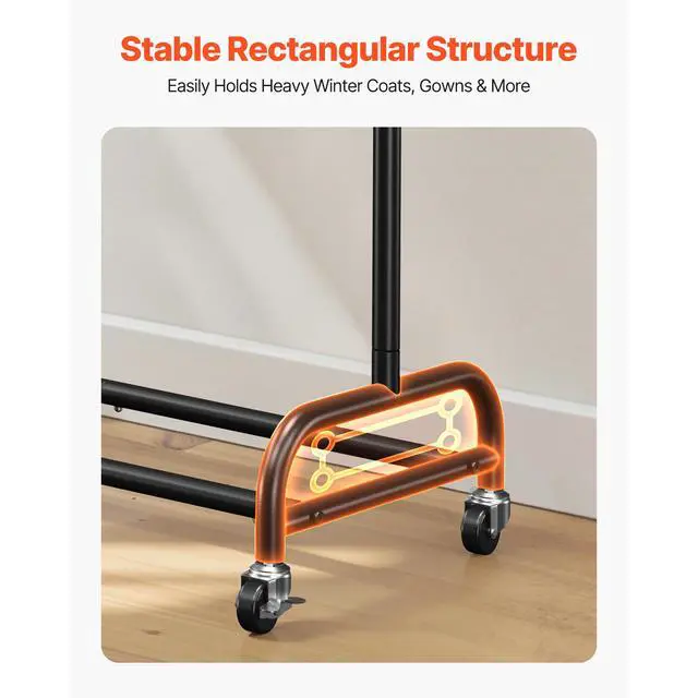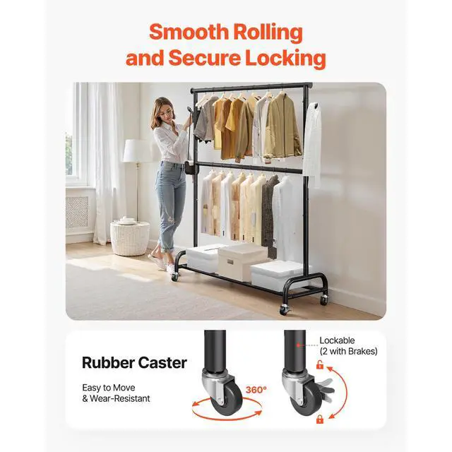VEVOR Clothes Rack, Rolling Clothing Garment Rack with Adjustable Crossbar and Side Hooks, 150 lbs Load Capacity, Heavy Duty Carbon Steel Clothing Racks with Wheels for Bedroom, Laundry, Living Room