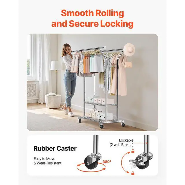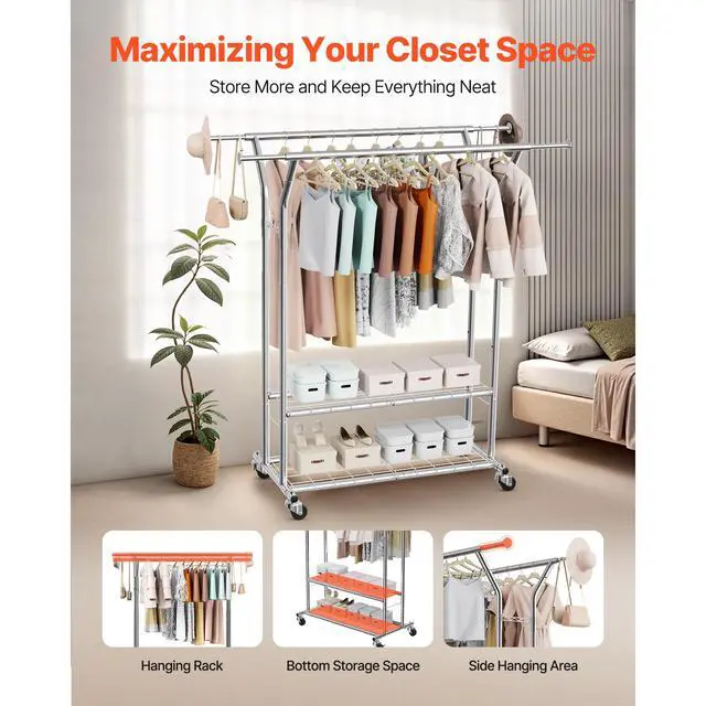 VEVOR Clothes Rack, Rolling Clothing Garment Rack with 2 Hanging Rods and 2 Storage Shelves, 264 lbs Load Capacity, Adjustable Height Carbon Steel Clothing Racks for Bedroom, Laundry, Living Room