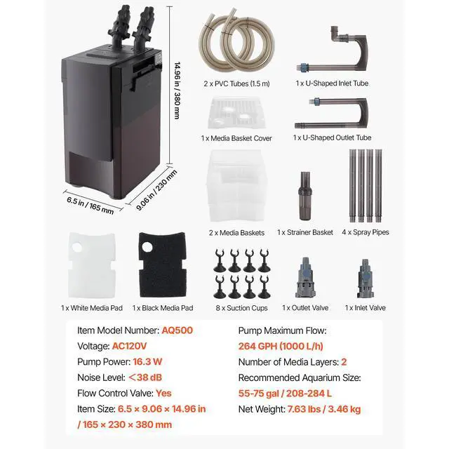 Noise Level: < 38 dB,Pump Maximum Flow: 264 GPH (1000 L/h),Recommended Aquarium Size: 55-75 gal/208-284 L,Item Size (L x W x H): 6.5 x 9.06 x 14.96 in/165 x 230 x 380 mm,Voltage: AC 120V,Pump Power: 16.3W,Item Model Number: QA500,Flow Control Valve: Yes,Number of Media Layers: 2,Net Weight: 7.63 lbs/3.46 kg