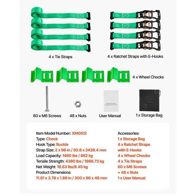 Tensile Strength: 4380 lbs/1986.73 kg,Hook Type: Buckle,Type: Chock,Load Capacity: 1460 lbs/662 kg,Item Model Number: XM0512,Strap Size: 2 x 96 inch/50.8 x 2438.4 mm,Product Dimensions: 11.81 x 3.78 x 1.89 in/300 x 96 x 48 mm,Net Weight: 18.63 lbs/8.45 kg