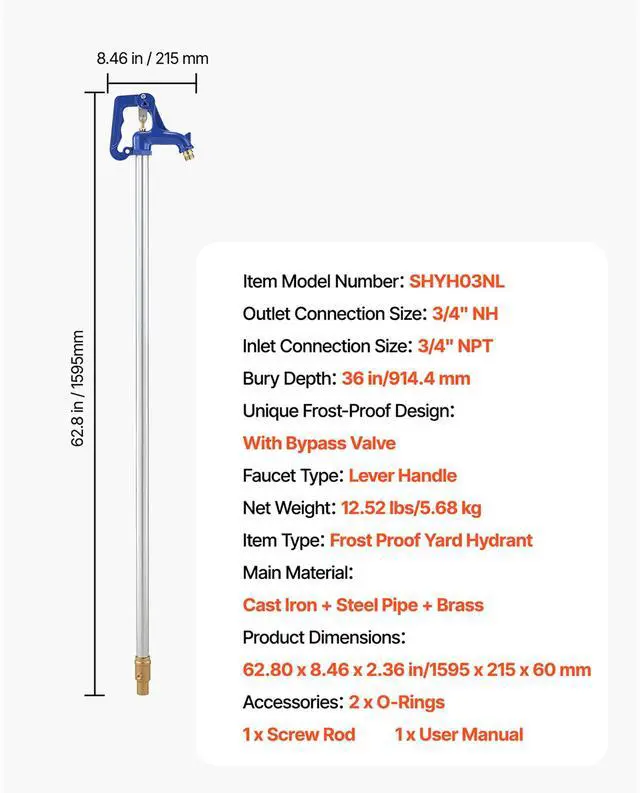 Outlet Connection Size: 3/4" NH,Item Model Number: SHYH03NL,Faucet Type: Lever Handle,Item Type: Frost Proof Yard Hydrant,Bury Depth: 36 in/914.4 mm,Product Dimensions: 62.80 x 8.46 x 2.36 in/1595 x 215 x 60 mm,Unique Frost-Proof Design: With Bypass Valve,Net Weight: 12.52 lbs/5.68 kg,Main Material: Cast Iron + Steel Pipe + Brass,Inlet Connection Size: 3/4" NPT
