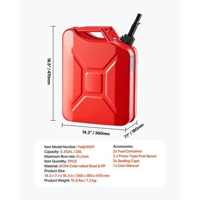 Item Quantity: 2PCS,Capacity: 5.3GAL / 20L,Item Model Number: Yoilp3001,Product Weight: 15.9 lbs / 7.2 kg,Material: DC04 Cold-rolled Steel & PP,Max Flow Rate: 6 L/min,Product Size: 14.2 x 7.1 x 20.1 in / 360 x 180 x 510 mm