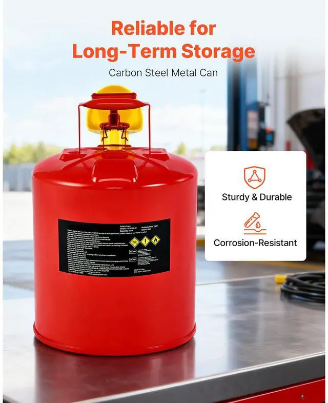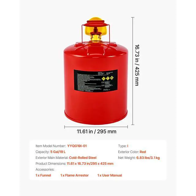 Exterior Main Material: Cold-Rolled Steel,Type: I,Capacity: 5 Gal/19 L,Item Model Number: YYQG19I-01,Exterior Color: Red,Product Dimensions: 11.5 x 16.65 in/292 x 423 mm,Net Weight: 6.39 lbs/2.9 kg