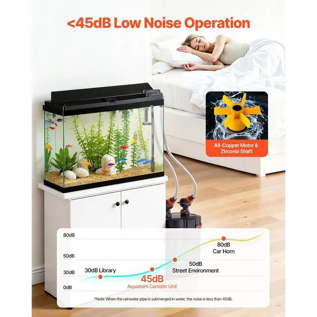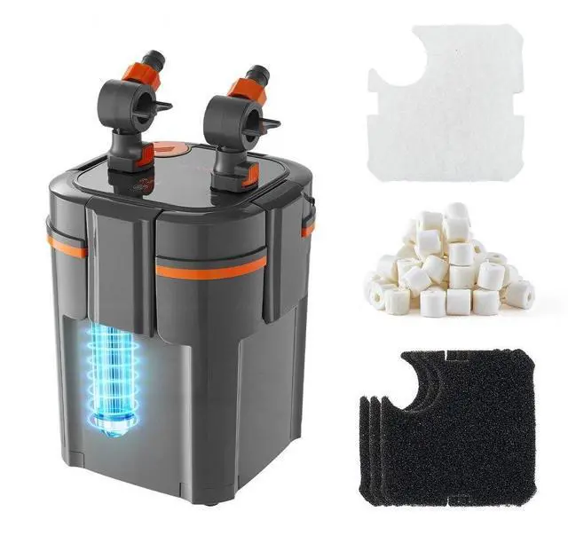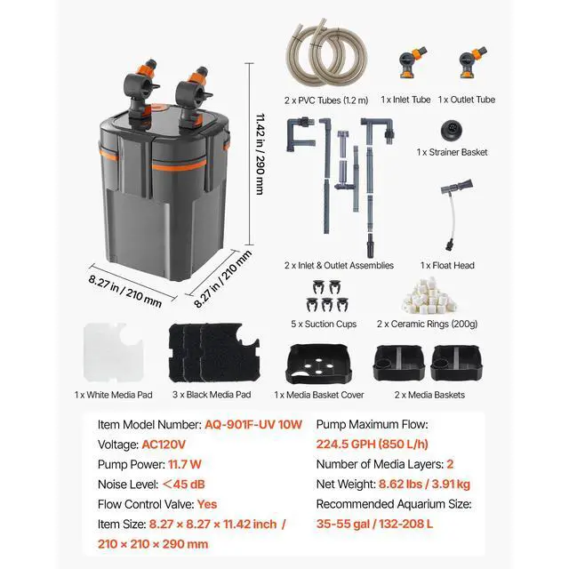 Noise Level: < 45 dB,Pump Maximum Flow: 224.5 GPH (850 L/h),Recommended Aquarium Size: 3555 gal 132208 L,Item Size (L x W x H): 8.27 x 8.27 x 11.42 in/210 x 210 x 290 mm,Voltage: AC 120V,Pump Power: 11.7W,Item Model Number: AQ-901F-UV 10W,Flow Control Valve: Yes,Number of Media Layers: 2,Net Weight: 8.62 lbs/3.91 kg