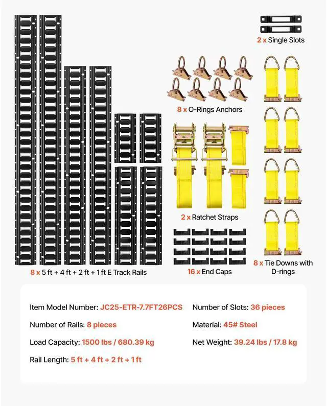 Rail Length: 5 ft+4 ft+2 ft+1 ft/ 1.5m+1.2m+0.6m+0.3m,Load Capacity: 1500 lbs/680.39 kg,Number of Rails: 8 pieces,Number of Anchor Points: 72 pieces,Item Model Number: JC25-ETR-5421FT36PCS,Material: 45# Steel,Net Weight: 39.24 lbs/17.8 kg