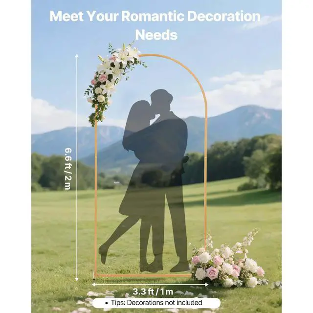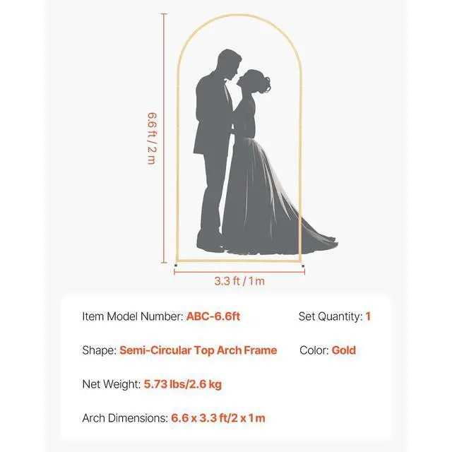 Set Quantity: 1,Shape: Semi-Circular Top Arch Frame,Color: Gold,Item Model Number: ABC-6.6ft,Net Weight: 5.73 lbs/2.6 kg,Arch Dimensions: 6.6 x 3.3 ft/2 x 1 m