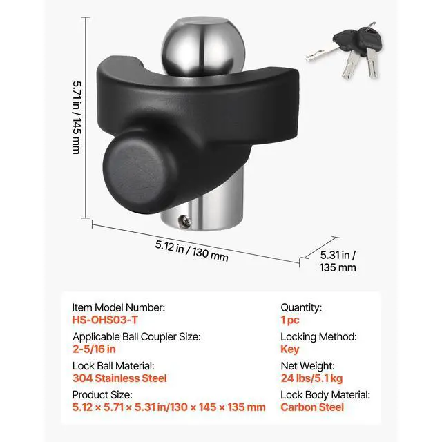 Lock Body Material: Carbon Steel,Lock Ball Material: 304 Stainless Steel,Item Model Number: HS-OHS03-T,Quantity: 1 pc,Locking Method: Key,Net Weight: 11.24 lbs/5.1 kg,Applicable Coupler Size: 2-5/16 in,Product Size: 5.12 x 5.71 x 5.31 in/130 x 145 x 135 mm