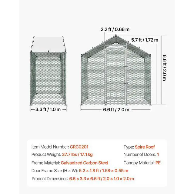 Type: Spire Roof,Door Size /H × W: 5.2 × 1.8 ft /1.58 × 0.55 m,Canopy Material: PE,Item Model Number: CRC0201,Product Weight: 37.7 lbs /17.1 kg,Number of Doors: 1,Frame Material: Galvanized Carbon Steel,Product Dimensions: 6.6 × 3.3 × 6.6 ft /2.0 × 1.0 × 2.0 m