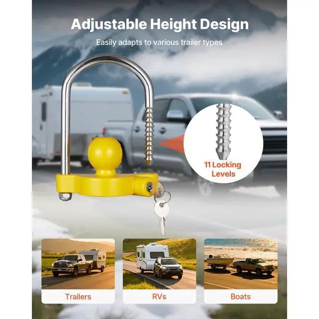VEVOR Trailer Hitch Lock Kit, Fits for 1-7/8 in, 2 in, 2-5/16 in Couplers, Heavy-Duty Anti-Theft Trailer Ball Lock with Keys, Prying-Resistant, Adjustable Height Design for RVs, Boats, Trailers