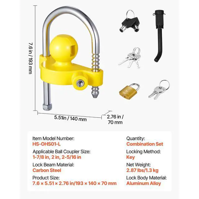 Lock Body Material: Aluminum Alloy,Lock Beam Material: Carbon Steel,Item Model Number: HS-OHS01-L,Quantity: Combination Set,Locking Method: Key,Net Weight: 2.87 lbs/1.3 kg,Applicable Coupler Size: 1-7/8 in, 2 in, 2-5/16 in,Product Size: 7.6 x 5.51 x 2.76 in/193 x 140 x 70 mm