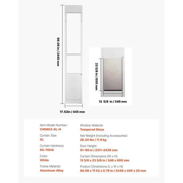 Net Weight (Including Accessories): 26.24 lbs / 11.9 kg,Curtain Size: XL,Window Material: Tempered Glass,Curtain Dimensions (W x H): 13 5/8 x 23 5/8 in / 346 x 600 mm,Color: White,Door Height: 9196 in / 23112439 mm,Item Model Number: CWM03-XL-H,Frame Material: Aluminum Alloy,Product Dimensions (L x W x H): 96.06 x 17.52 x 0.79 in / 2440 x 445 x 20 mm,Curtain Hardness: 6570HA