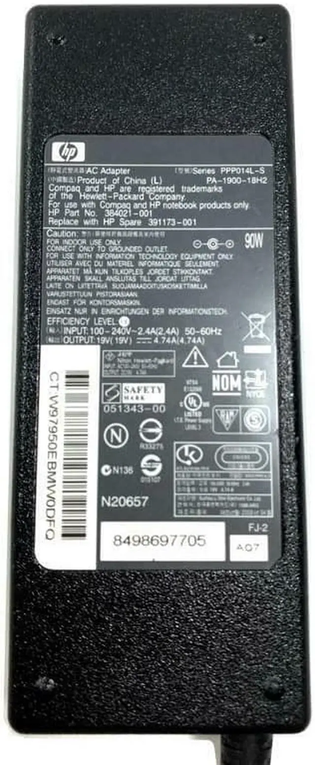 • ASIN~B00744UFQY0Part Number : 384021-001Manufacturer: HpWattage : 90 WattType : Ac AdapterCompatibility: For NotebooksWeight5.1Height1Width1Length1"