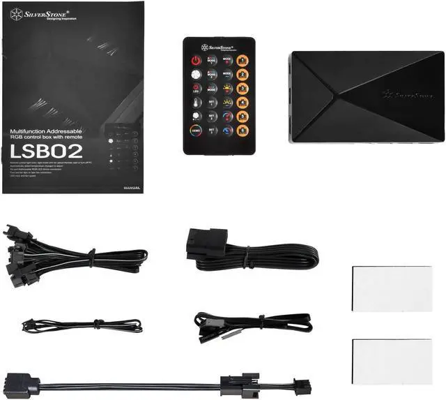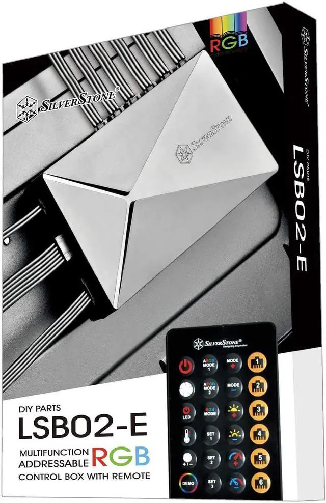 Superb a RGB and fan control, no software needed. Four lighting modes for nearly unlimited color combinations. Lsb02-e includes a thermal probe and allows you to monitor its temperature by changing colors. Up to four fans can be controlled by lsb02-e either automatically based on temperature or manually by You. Up to six addressable RGB devices (72 LEDs per port) can be controlled by lsb02-e. Cables included allow for connection of Silverstone or standard addressable RGB devices.
