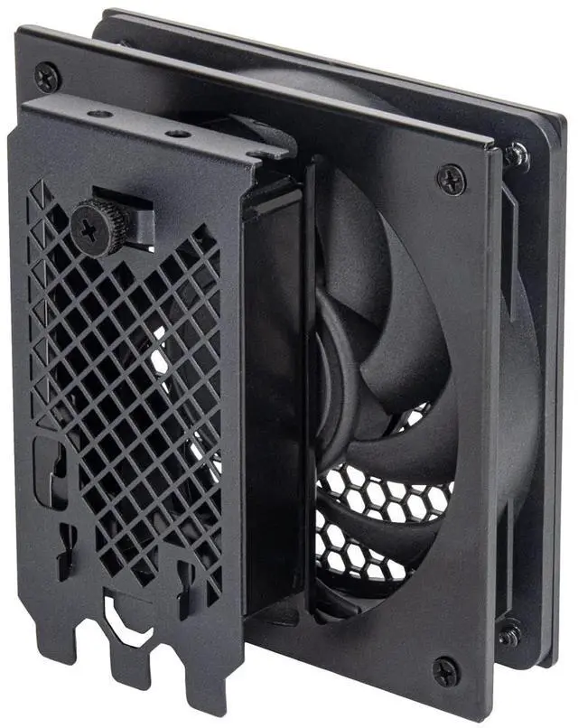 The FDP02 is an adapter bracket that attaches to any tower case with 7 or 8 PCI slots to increase the air movement inside the chassis for optimal PCH, M.2, GPU and other system components temperatures. It comes equipped with a single 120mm fan equipped with hydraulic bearing and a rotational speed of 1500 RPM. A metal fan grill is also attached to prevent any injuries caused by the fan blades during operation.
