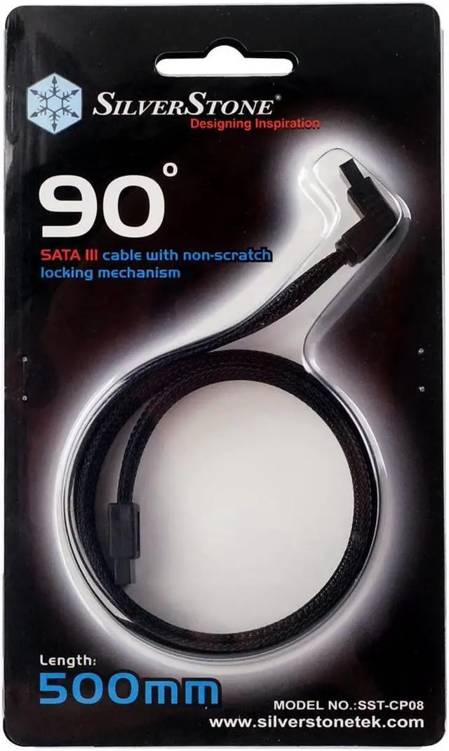 Silverstone CP08W With SATA III, Silverstone has created two suitable cables to match the higher bandwidth requirement with the CP07 (with 180 Degree connector) and CP08 (with 90 Degree connector). Unlike traditional SATA cables with metal clips that loose effectiveness with repeated usage due to scratching, the CP07 and CP08 achieves secure connection by utilizing precision designed and manufactured connector. Wrapped in attractive black / white and metallic layer for EMI protection, these new cables are great companions for running SATA 6Gb/s capable devices with optimum stability and style.
