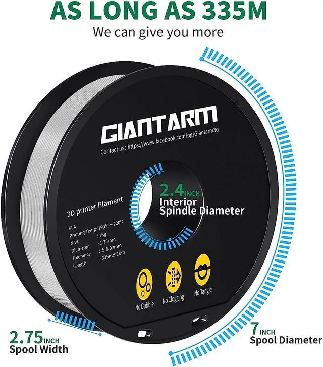 Toughness Enhanced PLA Filaments---GIANTARM PLA filaments have the advantages of incredible toughness, unique printing quality, high purity with low shrinkage and superb layer bonding, meeting your personalized printing demands for functional parts.