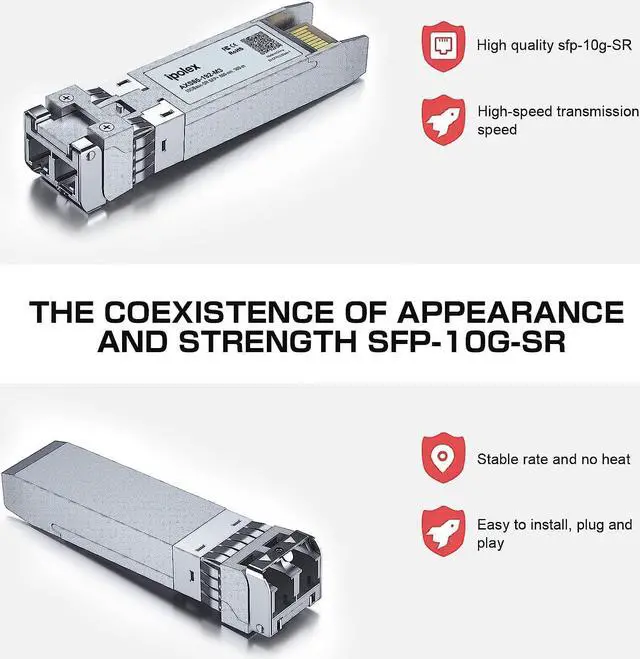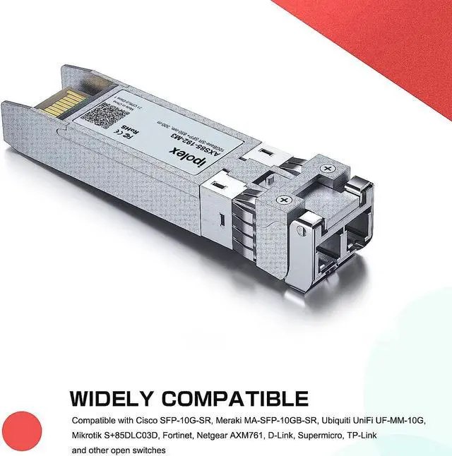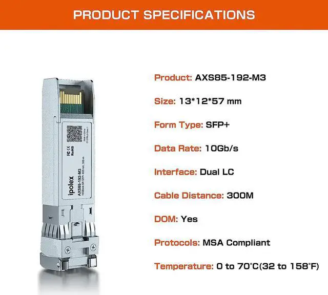 Plug and Play, Hot Pluggable SFP+ MSA Compliant, Compliant with IEEE 802.3ae 10GBase-SR/SW.