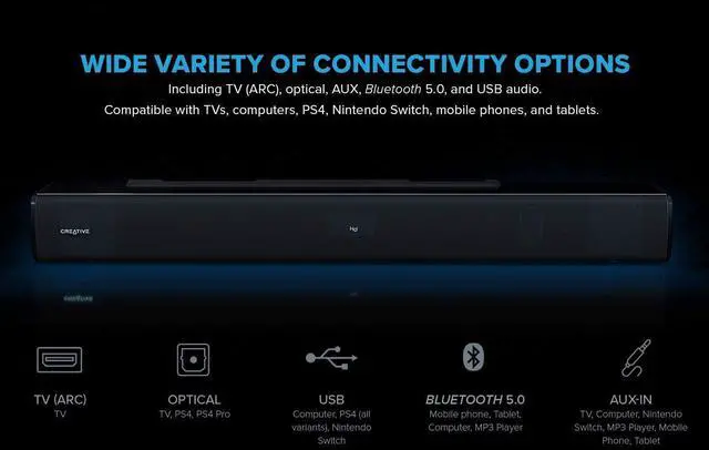 " Creative Stage V2 2.1 Soundbar with Subwoofer, Clear Dialog and Surround by Sound Blaster, Bluetooth 5.0, TV ARC, Optical, and USB Audio, Wall Mountable, Adjustable Bass and Treble, for TV Features POWERED BY SOUND BLASTER | Experience improved vocal intelligibility and wider surround experience with Clear Dialog and Surround, audio processing technologies powered by Sound Blasters expertise, to give you a cinema-like experience at the comfort of your own home HIGH-PERFORMANCE 2.1 SPEAKER | Housing two custom-tuned mid-range drivers and accompanied by a powerful long-throw tower-sized subwoofer, the Creative Stage V2 is capable of filling your room with captivating immersive audio and deep thumping bass ALL-IN-ONE AUDIO ENTERTAINMENT SYSTEM | Armed with all the possible connectivity options you can think ofTV ARC, optical, AUX, Bluetooth, and even USB audio, the Creative Stage V2 is the one-stop audio entertainment system for all your devices from TVs and computers to mobile phones and gaming consoles CONVENIENT CONTROLS VIA REMOTE | The Creative Stage V2 comes with a remote control which not only allows you to control playback features conveniently, but also adjust treble and bass setting, select audio modes, or change the input option with ease MATCHES ANY DÉCOR | Minimalist and sleek, the Creative Stage V2 is the perfect complement to your glorious TV set and blends seamlessly into any room regardless of their interior design. It wont steal your attention from the screen, but it makes its presence felt loud and clear regardless. For the space-constrained, the soundbar is also wall-mountable so you can hang it on the wall below your TV Specifications Connectivity Technology Bluetooth, Auxiliary, USB Speaker Type Wireless, Subwoofer, Surround, Wall Mount, Soundbar Brand Creative Mounting Type Usb,Soundbar Audio Output Mode Surround "