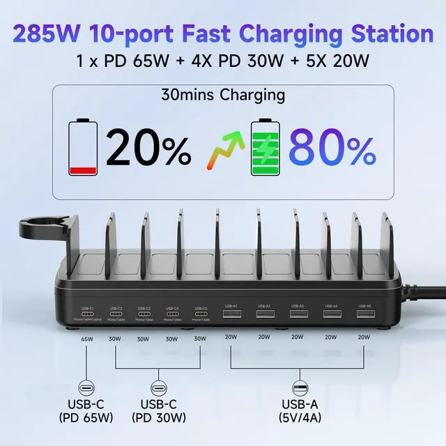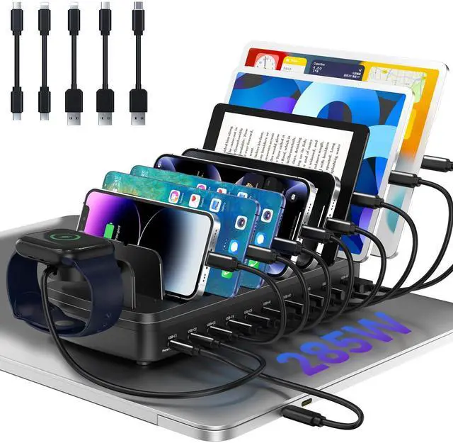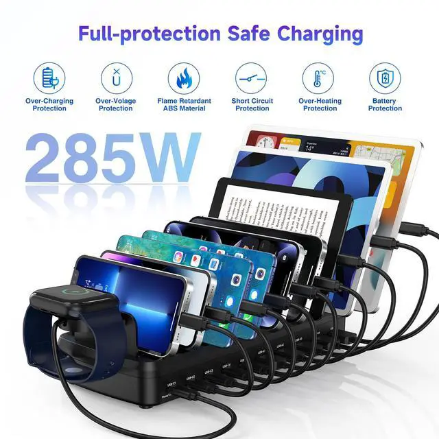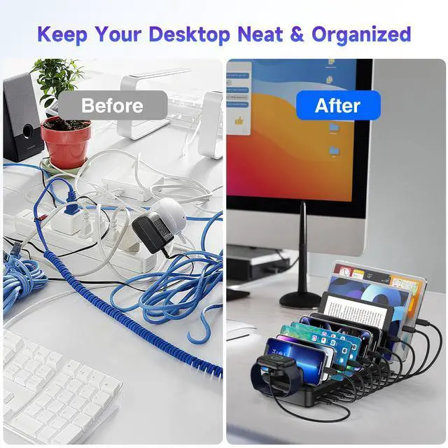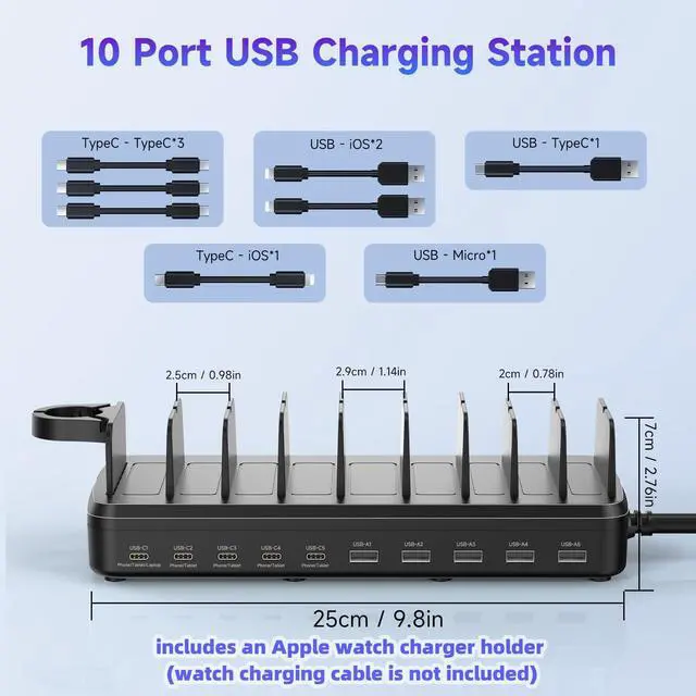 MERGROLY Charging Station for Multiple Devices, 50W 6-Port Multiple Charging station with10-Slot, Detachable Divider/ Watch Holder, 6 Mixed Cable Compatible with iPhone/iPad/Other Electronic, Black