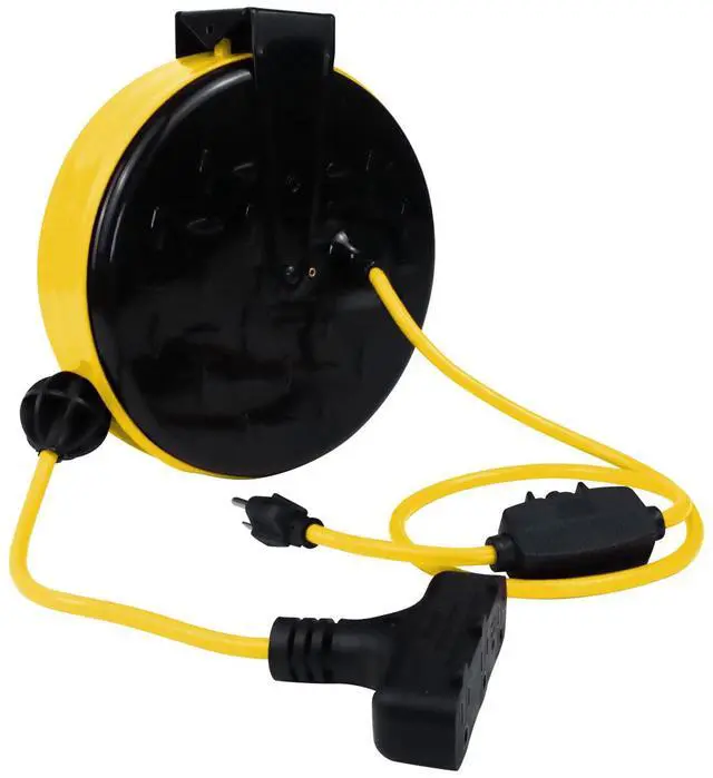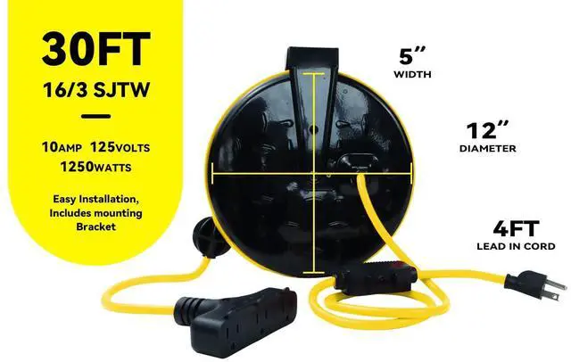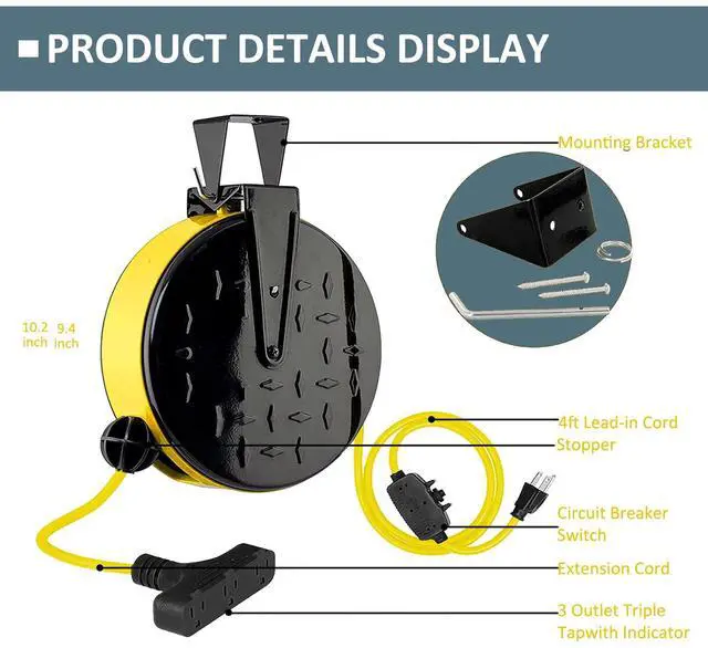 This UL-listed power cord reel is a reliable choice for high-demand environments. Equipped with a built-in 10A circuit breaker, it offers robust protection against short circuits and overloads. Constructed with a sturdy metal diamond plate, this electrical cord reel is built to withstand heavy-duty use, making it ideal for garages, workshops, and other demanding settings.