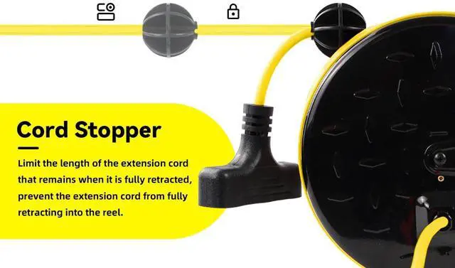 Featuring a 30-foot 16/3C gauge power cord and a 4-foot lead-in cord, this extension reel ensures you have ample reach for all your electrical needs. The adjustable stopper allows you to customize the cord length and secure it in place, providing flexibility for various tasks. The auto-rewind mechanism eliminates the hassle of manual winding and tangled cords, allowing the retractable extension cord reel to retract smoothly and quickly when not in use, keeping your workspace neat and organized.