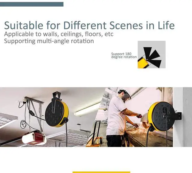 The electrical reel also includes a 180-degree swivel bracket, which simplifies installation on walls or ceilings and offers convenient access to power tools and equipment from multiple directions. This swivel feature not only enhances your work efficiency but also makes storage easy when the electrical cord reel is not in use.