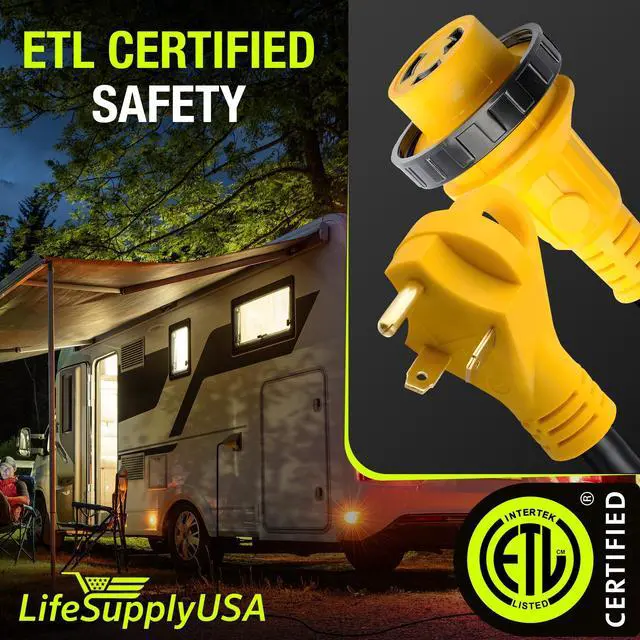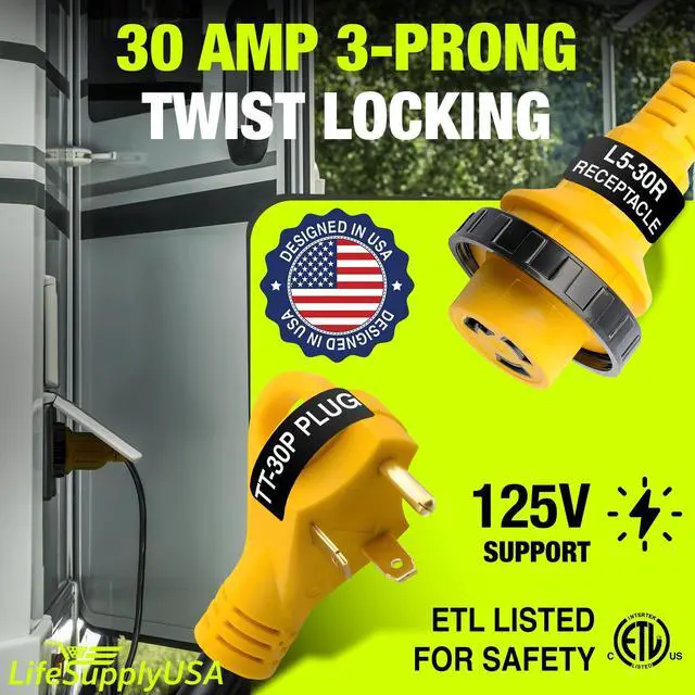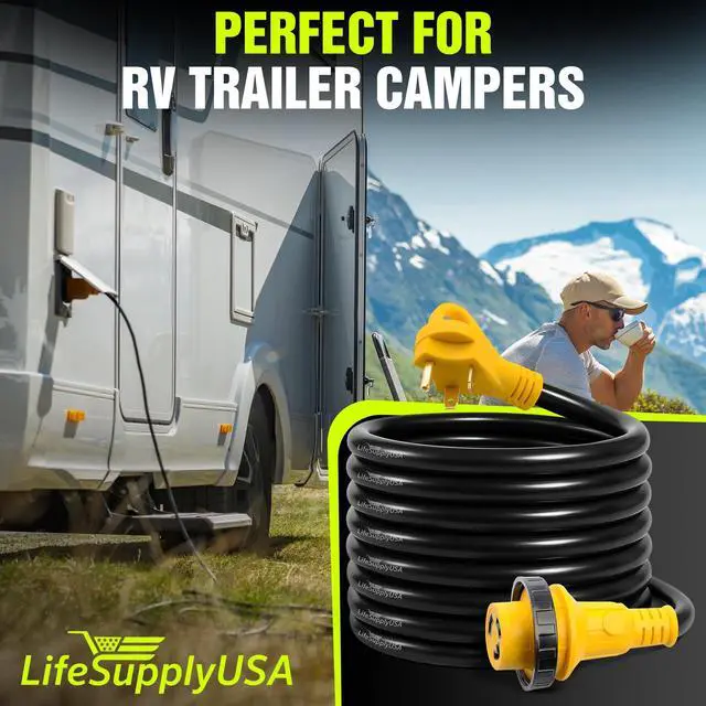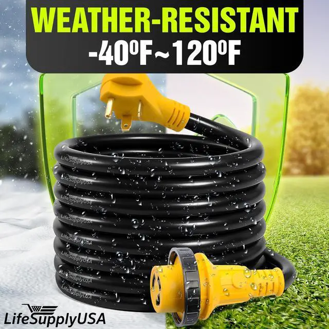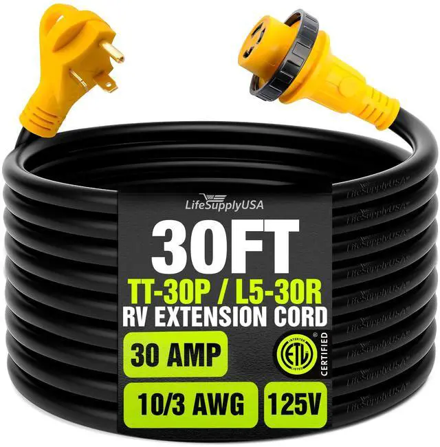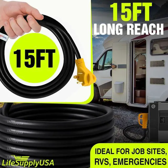 The LifeSupplyUSA 15ft RV Extension Cord is a reliable and durable solution for powering your RV, whether you're camping or staying at an RV park. Featuring heavy-duty 10/3 AWG copper wiring, this extension cord ensures stable power transfer, capable of handling up to 30 AMPs. The 3-prong male plug (TT-30P) is designed with a grip handle, making it easy to plug in and unplug without strain, while the female twist-lock connector (L5-30R) ensures a secure connection to your RVs power inlet. With a 15-foot length, this extension cord offers flexibility, allowing you to connect to power sources that may be located farther from your vehicle. The STW thermoplastic jacket is designed for outdoor use, providing resistance against harsh weather conditions like rain, snow, and UV rays, ensuring that your cord remains durable and functional over time. The twist-lock design guarantees a stable, firm connection, preventing accidental disconnections due to movement or vibrations. For added convenience, the cord includes a hook and loop strap, making it easy to coil and store when not in use. Whether you need power for your appliances or electrical systems on the road, the LifeSupplyUSA 30ft RV Extension Cord is the perfect heavy-duty option to keep your RV powered and ready for any adventure.