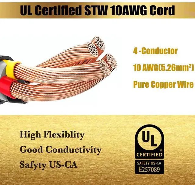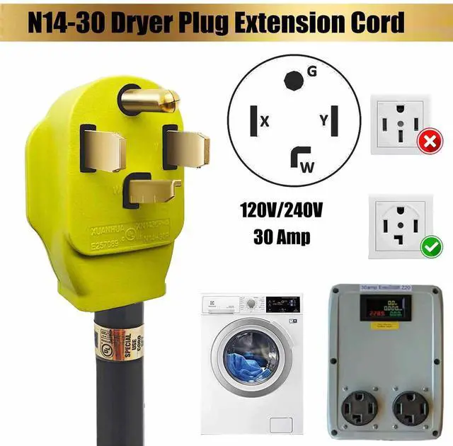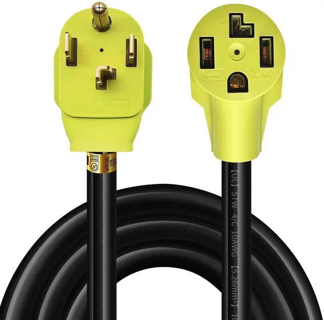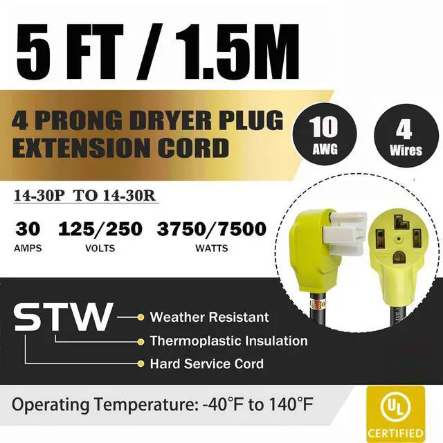 Specifications: Male Plug:NEMA 14-30 (4 Prong Direct Plug-in) Female Receptacle:NEMA 14-30 Extension Length: 5 FT (1.52 Meters+) Cord Guage4-conductor STW 10 AWG(5.26 mm²) MaterialPVC+pure copper Rating Current:30Amp Rating Volt220V-250V / 110V-125V. Rating Power:Max.7500 Watts Certification: ULCA&USE257089 If you have any questions, please feel free to contact us. As the original manufacturer, we are always on the way to excellence thanks to your precious feedbacks.