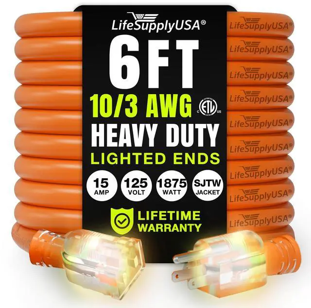 Durable Performance Rely on the LifeSupplyUSA Heavy Duty Outdoor Extension Cord for unmatched durability and reliability, whether at home, work, or on a construction site. Engineered to perform in harsh conditions, this indoor & outdoor heavy duty extension cord 3 prong model withstands extreme temperatures and features a waterproof design, ensuring it lasts through any challenge. Built with a robust vinyl jacket, the three prong extension cord resists oil, grease, moisture, and abrasion, protecting against electrical hazards and wear. The durable construction of the power cord extension not only ensures safe operation across diverse environments but also contributes to the cord's longevity, making it a dependable choice for any task. Outdoor Electric Cord with Enhanced Visibility The lighted end of the indoor & outdoor electrical cord indicates power while the brightly colored PVC jacket improves visibility, minimizing tripping hazards in busy or dimly lit areas. This feature enhances safety and makes the electric cord extension easily identifiable among other tools, preventing accidental disconnections and ensuring smooth operation. Versatile and Powerful Electric Cords From powering heavy-duty equipment like drills and saws to lighting up your holiday decorations, LifeSupplyUSA Indoor & Outdoor Extension Cords are versatile enough to handle it all. Whether tackling major construction jobs, home renovations, or casual outdoor setups, this outdoor waterproof extension cord adapts seamlessly to your needs. Certified for Optimal Performance This 6 ft,10 Gauge, 3 Prong SJTW waterproof outdoor extension cord is ETL listed, meeting North American safety standards. Supporting 15 AMPs, 125 Volts, and up to 1875 Watts, the heavy duty drop cord extension power cord is designed for extra safety and robust performance, capable of powering high-demand equipment with ease and reliability.