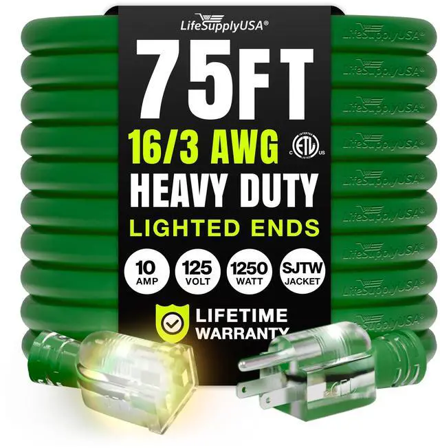 Durable Performance Rely on the LifeSupplyUSA Heavy Duty Outdoor Extension Cord for unmatched durability and reliability, whether at home, work, or on a construction site. Engineered to perform in harsh conditions, this indoor & outdoor heavy duty extension cord 3 prong model withstands extreme temperatures and features a waterproof design, ensuring it lasts through any challenge. Built with a robust vinyl jacket, the three prong extension cord resists oil, grease, moisture, and abrasion, protecting against electrical hazards and wear. The durable construction of the power cord extension not only ensures safe operation across diverse environments but also contributes to the cord's longevity, making it a dependable choice for any task. Outdoor Electric Cord with Enhanced Visibility The lighted end of the indoor & outdoor electrical cord indicates power while the brightly colored PVC jacket improves visibility, minimizing tripping hazards in busy or dimly lit areas. This feature enhances safety and makes the electric cord extension easily identifiable among other tools, preventing accidental disconnections and ensuring smooth operation. Versatile and Powerful Electric Cords From powering heavy-duty equipment like drills and saws to lighting up your holiday decorations, LifeSupplyUSA Indoor & Outdoor Extension Cords are versatile enough to handle it all. Whether tackling major construction jobs, home renovations, or casual outdoor setups, this outdoor waterproof extension cord adapts seamlessly to your needs. Certified for Optimal Performance This 75 ft,16 Gauge, 3 Prong SJTW waterproof outdoor extension cord is ETL listed, meeting North American safety standards. Supporting 10 AMPs, 125 Volts, and up to 1250 Watts, the heavy duty drop cord extension power cord is designed for extra safety and robust performance, capable of powering high-demand equipment with ease and reliability.